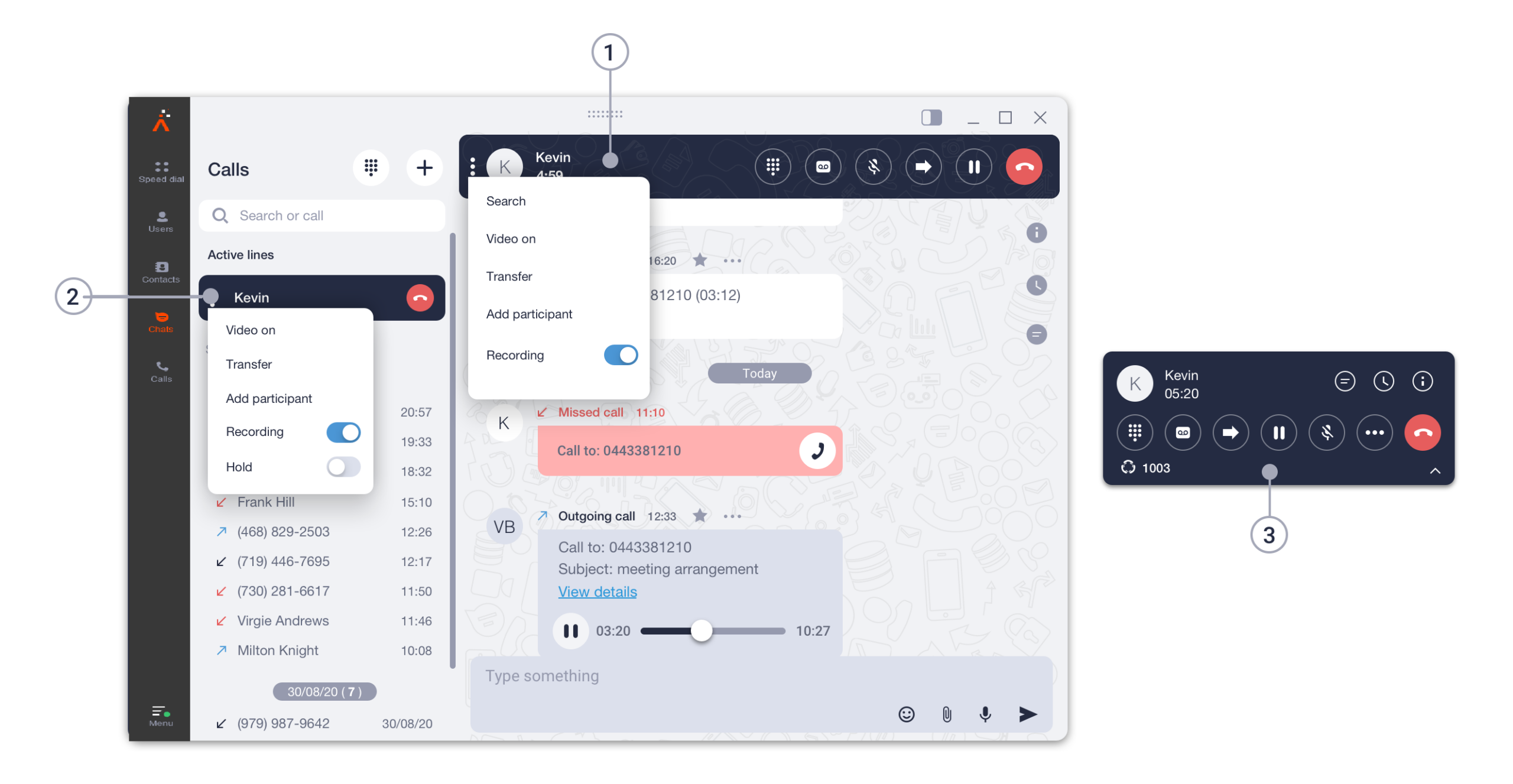 - Call panel. You can access a call panel by clicking on a contact you’re currently talking to in the list of contacts, chats, or calls, or by double-clicking on an Active Line.