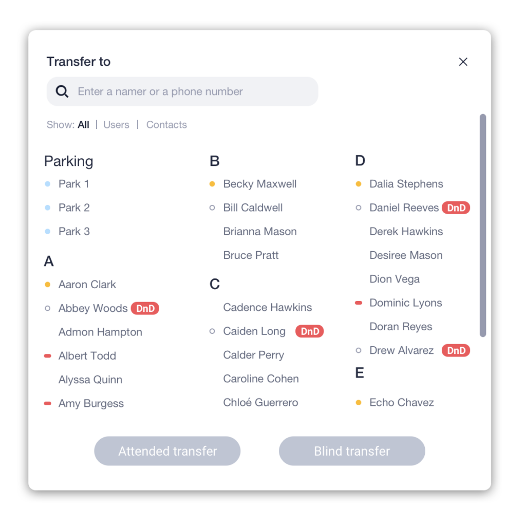 OR click the three‑dot menu on an Active Line and select Transfer. - Select a contact or enter a phone number in the search field.